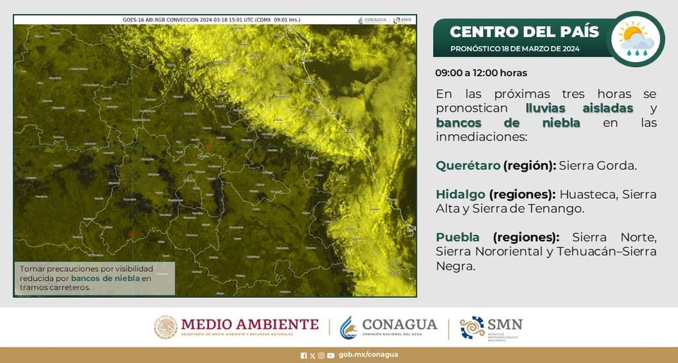 Se prevé descenso de temperatura y condiciones para la formación de densos bancos de niebla en los estados del norte, noreste y oriente de México; evento de Norte con rachas de viento de 60 a 80 kilómetros por hora (km/h) y oleaje de 1 a 3 metros (m) de altura en costas de Tamaulipas y Veracruz, y viento de componente norte con rachas de 50 a 70 km/h en el Istmo y Golfo de Tehuantepec durante la noche.