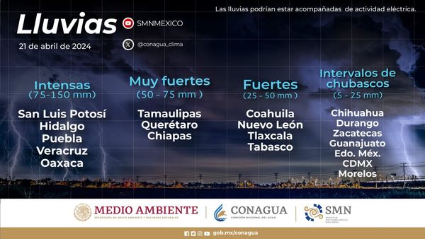 Asimismo, se pronostica viento con rachas de 50 a 70 km/h y tolvaneras en Aguascalientes, Chihuahua, Coahuila, Durango, San Luis Potosí y Zacatecas; rachas de 40 a 60 km/h con posibles tolvaneras en Ciudad de México, Estado de México, Guanajuato, *Hidalgo*, Jalisco, Nuevo León, Oaxaca, Puebla, Querétaro y Tlaxcala, así como rachas de la misma intensidad en Campeche, Quintana Roo y Yucatán.