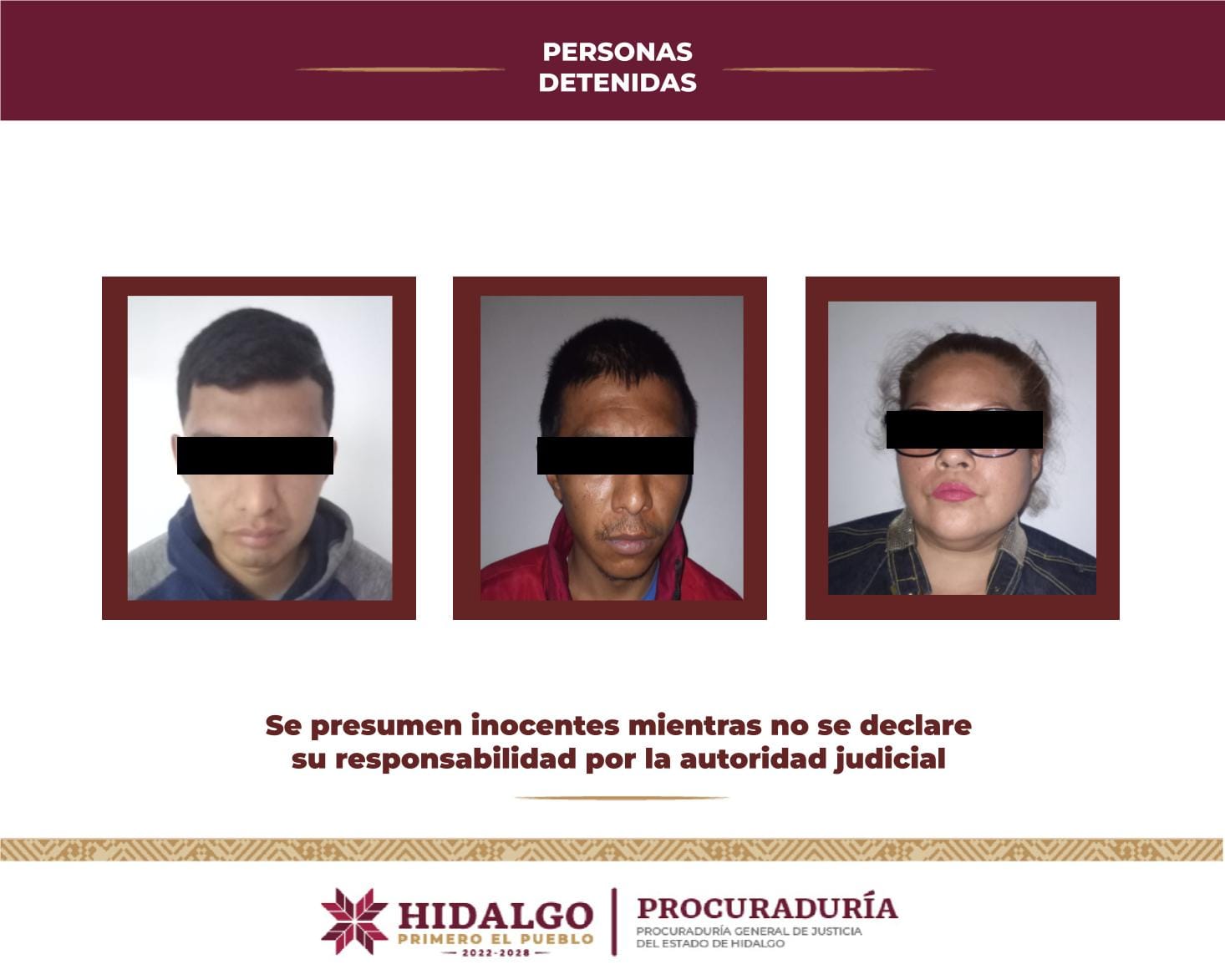Dicho mandamiento judicial que fue ejecutado por elementos de la División de Investigación adscritos a la Unidad de Alto Impacto de la PGJEH, sirvió para detener a tres personas adultas identificadas con iniciales G. P. O., I. B. M., A. C. S., así como a una menor de edad de identidad reservada.