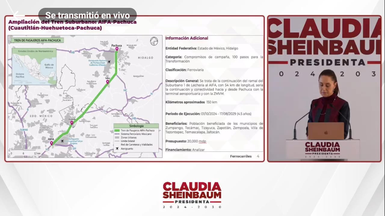 Par el caso del Tren AIFA-Pachuca, informó que el periodo de ejecución será de cuatro años y medio (del 1 de octubre de 2024 al 17 de agosto de agosto de 2019, aproximadamente).
