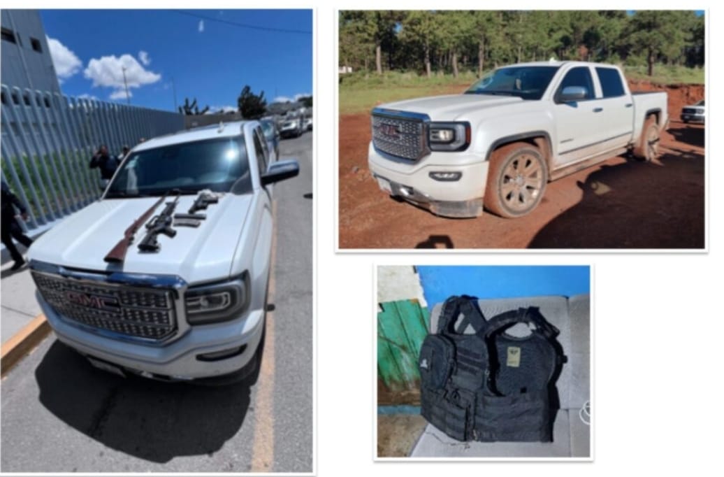 Durante la operación, se encontró una camioneta GMC Sierra de color blanco, junto con un subfusil tipo Uzi, una escopeta, un fusil semiautomático AR-15, un cargador de subfusil tipo Uzi y un cargador de fusil semiautomático.