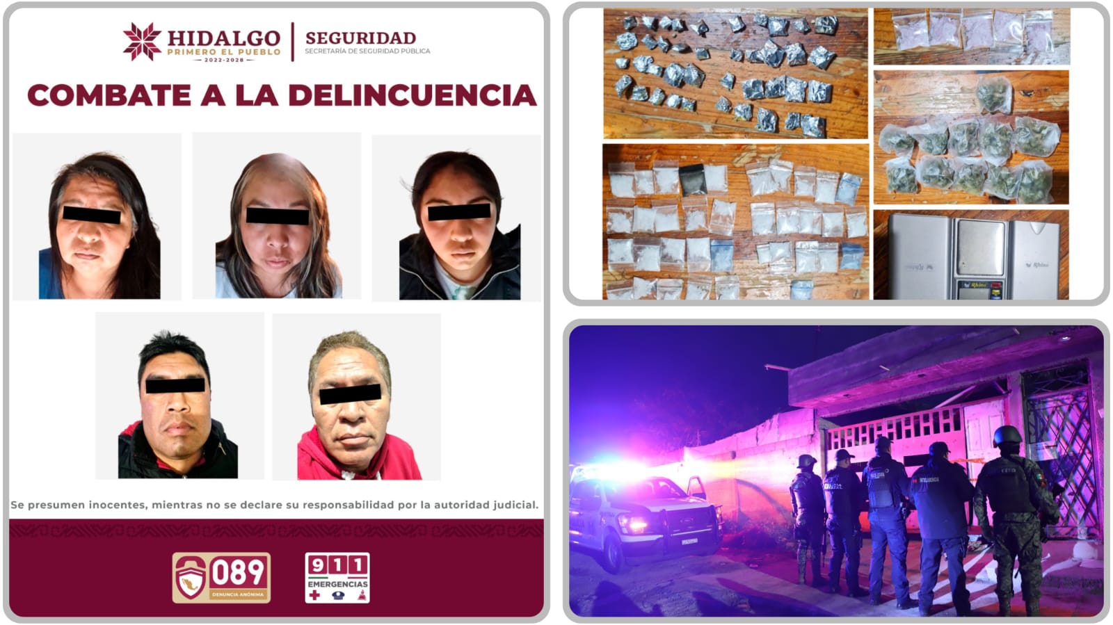 Agentes de la Secretaría de Seguridad Pública de Hidalgo (SSPH) detuvieron a tres mujeres y dos hombres durante un operativo simultáneo efectuado en dos domicilios del municipio de Zempoala, como parte de las acciones del organismo para combatir de manera frontal la delincuencia.
