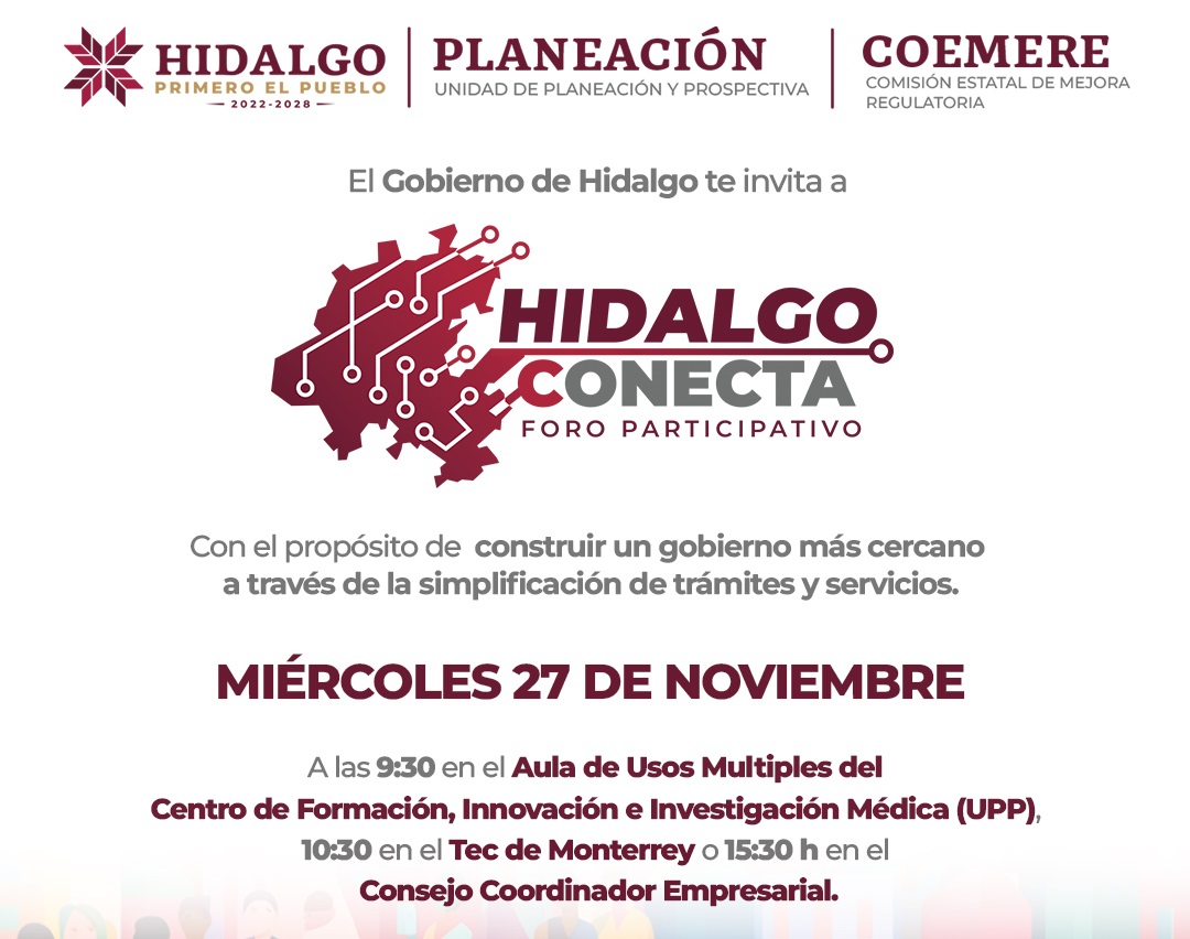 Con el propósito de simplificar trámites y servicios, así como avanzar hacia una gestión más eficiente e inclusiva, el gobierno de Hidalgo llevará a cabo el Foro “Hidalgo Conecta: Hacia una Política de Gobernanza y Desarrollo Digital”.