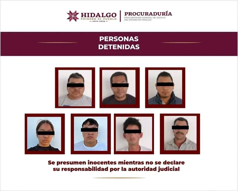 Dichos mandamientos judiciales fueron ejecutados por la Agencia de Investigación Criminal de Hidalgo este 23 de abril de 2025 y como resultado de los operativos simultáneos se detuvo a siete personas, entre ellas seis hombres identificados como F. I. F. M, Á. P. M. Q., L. R. A., S. L. B., M. A. S. R., I. P. M., y una mujer de iniciales Y. S. C.